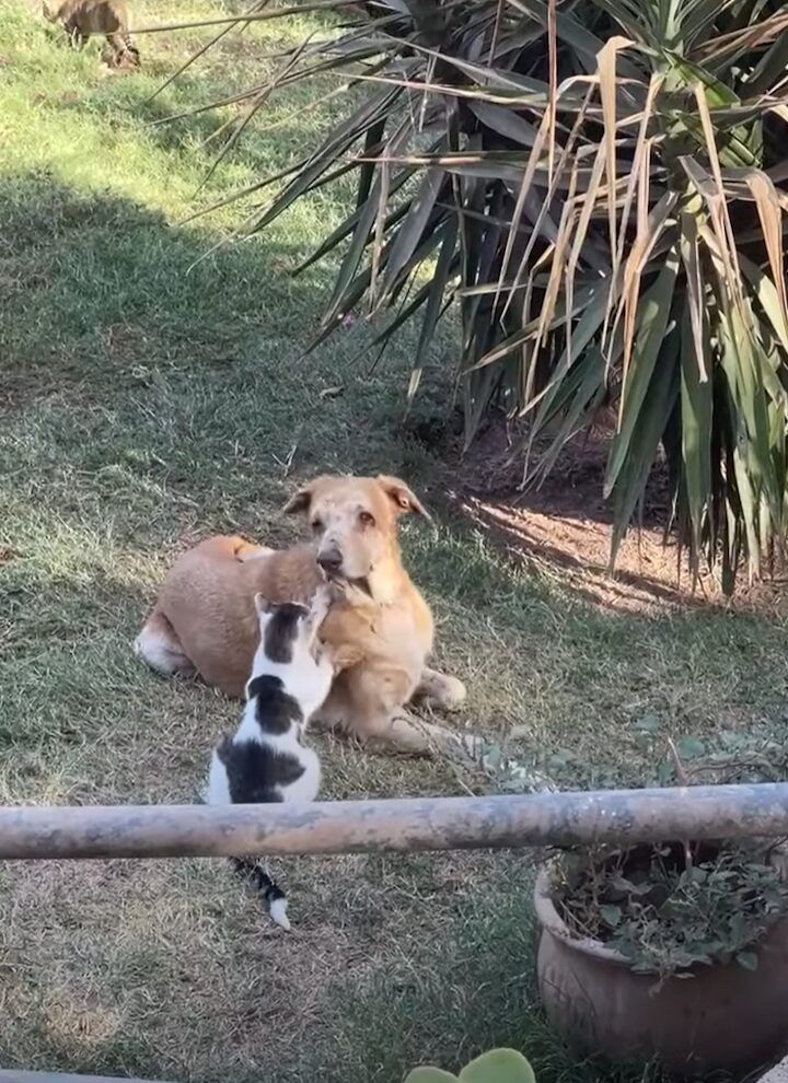 猫にマッサージしてもらっている犬。 その様子は、こちらの動画からご覧いただけます。