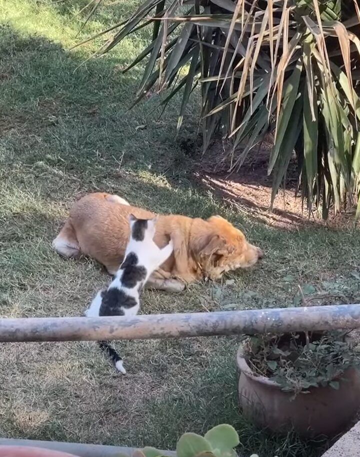 犬に寄り添う猫。 この猫は、犬のことをもみもみとやさしく丁寧にマッサージをはじめました!! どうやら、ふたりは仲良しさんみたいです。