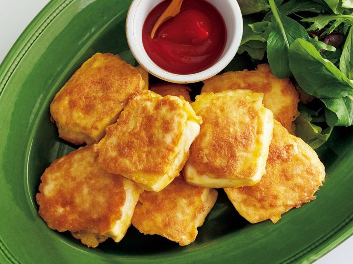フライパンにオリーブオイル大さじ1/2を中火で熱し、鶏肉と豆腐を1切れずつ組み合わせて、卵液をからめながら入れる。焼き色がついたら返し、色が変わったら再び卵液をからめて並べ入れる。ふたをして弱火で両面を2~3分ずつ焼く。ベビーリーフとともに器に盛り、トマトケチャップ適宜を添え、つけながら食べる。