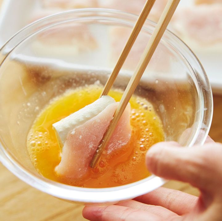 鶏肉は幅7~8mmの8等分のそぎ切りにする。豆腐は鶏肉の大きさに合わせて幅1cmの一口大にし、8枚に切る。鶏肉、豆腐に塩小さじ1/4、こしょう少々をふり、小麦粉大さじ1をまぶす。ボールに卵を溶きほぐし、塩、こしょう各少々を加えて混ぜる。