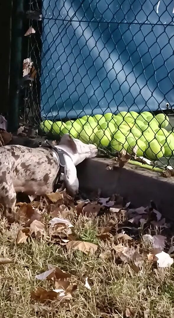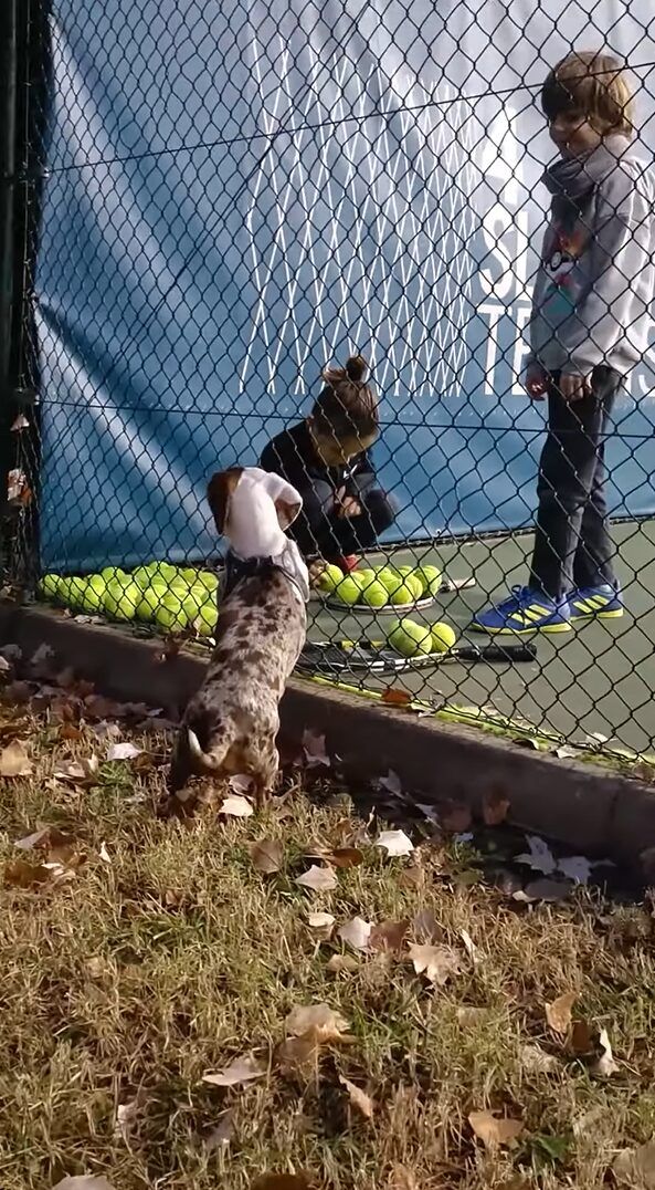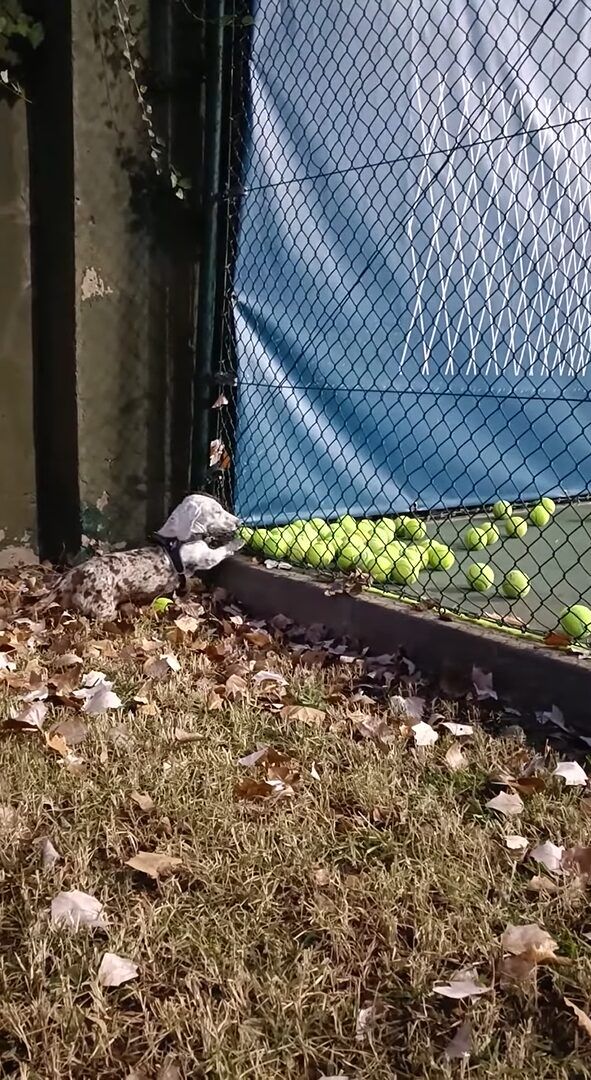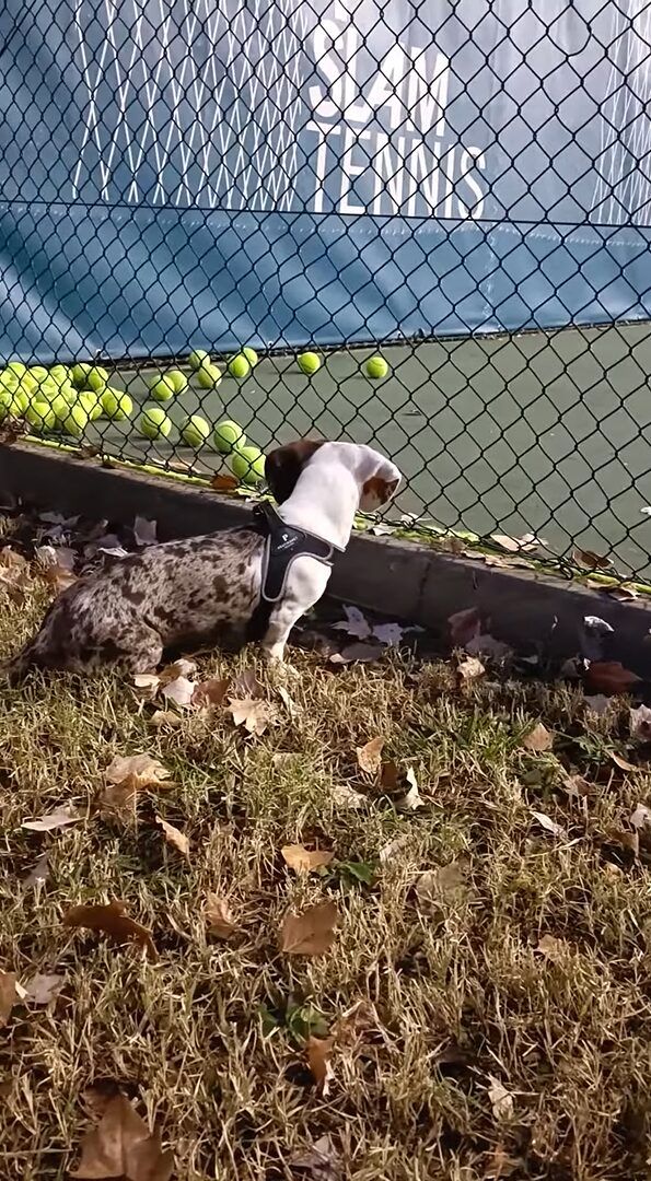 テニスの練習に連れて行ってもらった愛犬。 コートの隅に寄せられていくテニスボールが気になって仕方がないようですが、もしかして自分のオモチャだと思ったのでしょうか?