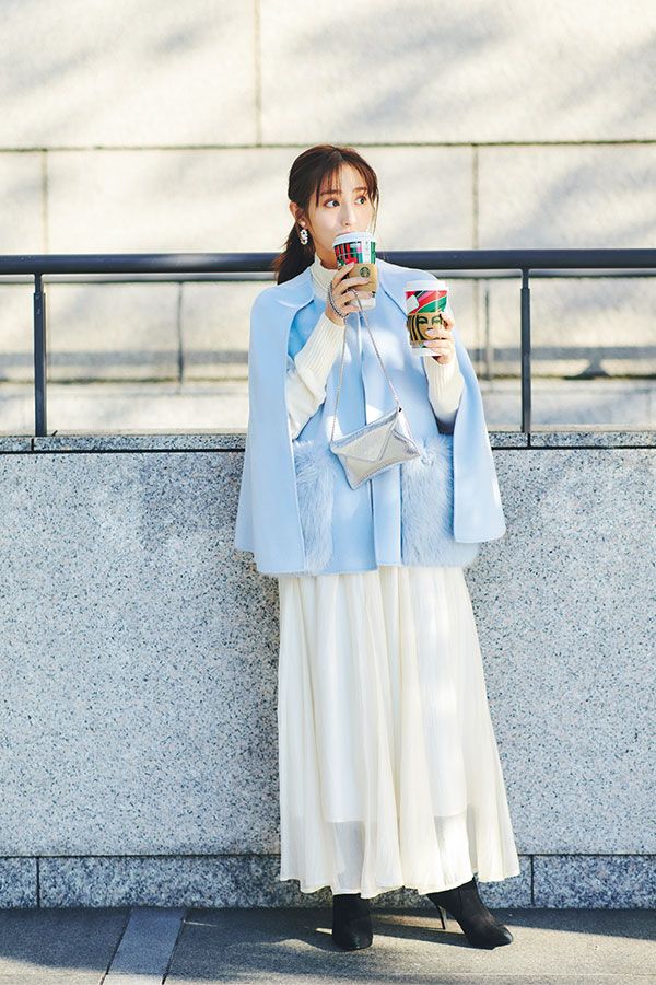 プレーンなホワイトコーデも、水色ケープを主役にすれば透明感のある冬のモテコーデが完成♪ 落ち感スカートで足元の印象をすっきりと見せて。