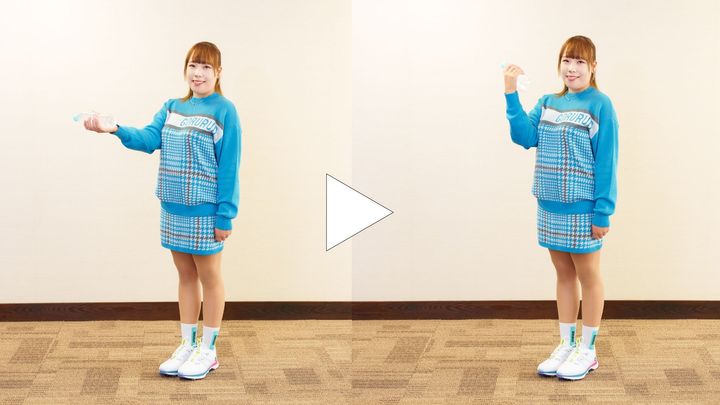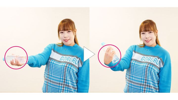次に、手首のトレーニングです。先ほどと同じように手のひらを上に向けた状態でペットボトルを持ったら、手首を手のひら側に曲げて伸ばします。これを20回繰り返しましょう。やはり左右それぞれ行います。