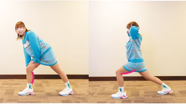 左足を前に出す際にグーッと体重を乗せ、左足の股関節、ふくらはぎ、太モモ裏、お尻あたりに負荷がかかっていることを確認しましょう。その後、最初の形に戻り、今度は右足を前に出します。やはり、体重をグーッと乗せていきますが、今度は右足の股関節、ふくらはぎ、太モモ裏、お尻あたりに負荷がかかります。