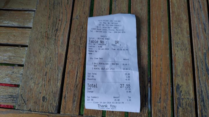 練習場は打ち下ろしの形になるためか、1階と2階の打席で料金は変わりません。練習料金はクラブ1本借りて、100球ボールを打って27.55リンギット。日本円で約880円でプレーできました。