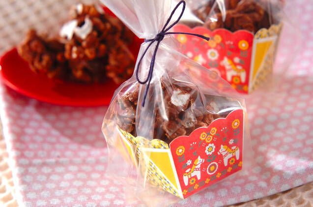 レンジで作れるチョコレート味のマフィンです。ホットケーキミックスを使うからお子さんでもできる簡単レシピ。かわいくラッピングして配りたいですね。