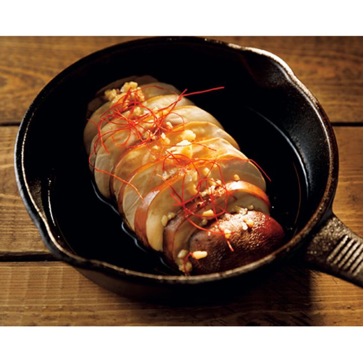 驚くほど大きな静岡県産マッシュルームに、にんにくと糸唐辛子を加えてアヒージョに。肉厚な身を嚙み締めるごとに旨みがあふれる。