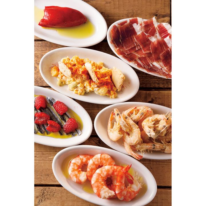 生ハムベジョータ、赤ピーマンにタラのすり身を詰めた「ピキージョ」、ほのかな酸味のマヨネーズで軽やかに和えたポテトサラダ「エンサラディーヤルサ」、さくっと香ばしい「芝海老のフリット」などなど、料理の内容は日によって変わる。