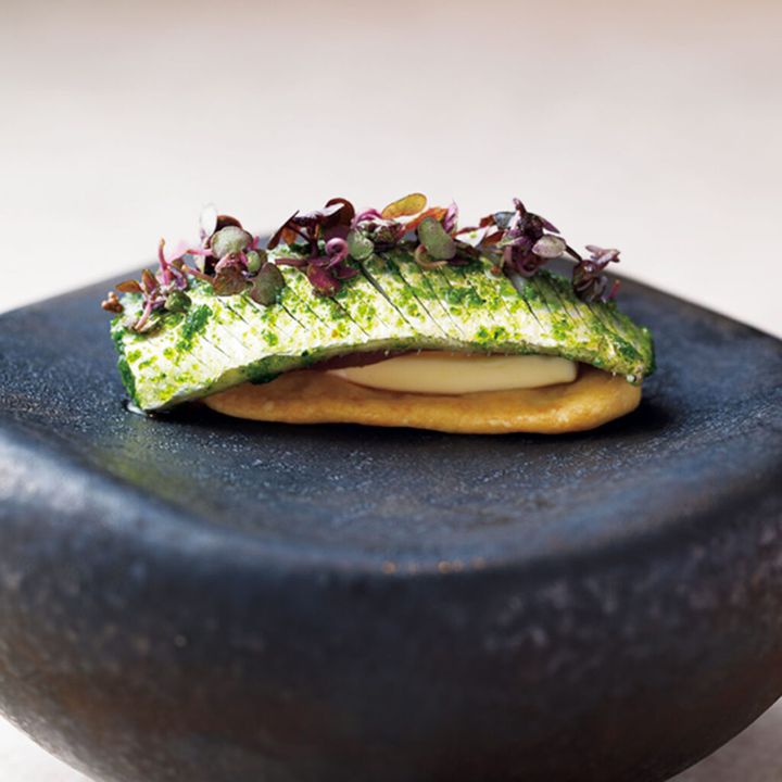 ピッツァのように楽しむ「コカ」をフィンガーフードに。カリッと焼いた生地に、イタリアンパセリのソースで彩った真イワシの酢漬け、燻製バター、アンチョビ、ローストした松の実をのせて。料理はすべて¥8,800のコースより
