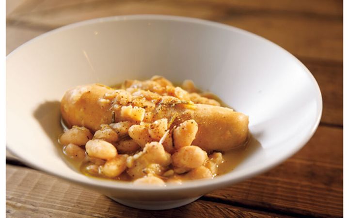 肉々しい味わいの白ソーセージに白いんげん豆を合わせた、現地ではお馴染みの郷土料理。「ブティファラブランカと白いんげん豆の煮込み」。※利用する時間帯や座席によって料理の価格は変動します