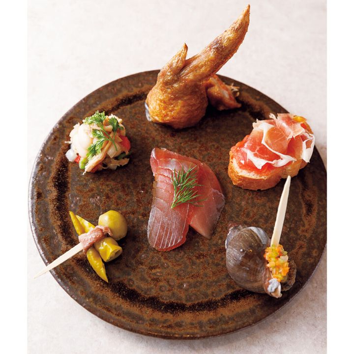 自家製チョリソーを詰めて揚げた手羽先、イベリコ豚の生ハムをのせたパン・コント・マテ、磯つぶ貝、ピンチョスの原型とされる青唐辛子・アンチョビ・オリーブを串に刺したヒルダ、うさぎと白いんげん豆のサラダ、本まぐろの自家製生ハムなど、時季によって変わるピンチョスを盛り合わせに。