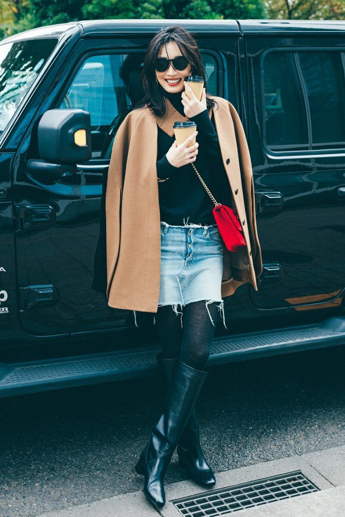タイツで素肌をカバーできる冬は、ミニボトムスに照れずにトライできるチャンス。あくまでもさらりと取り入れたいときは、品よく決まる黒タートルが強い味方に。キャメルコートや赤バッグを選べば、暗くなりがちな冬コーデに新鮮味が宿ります。