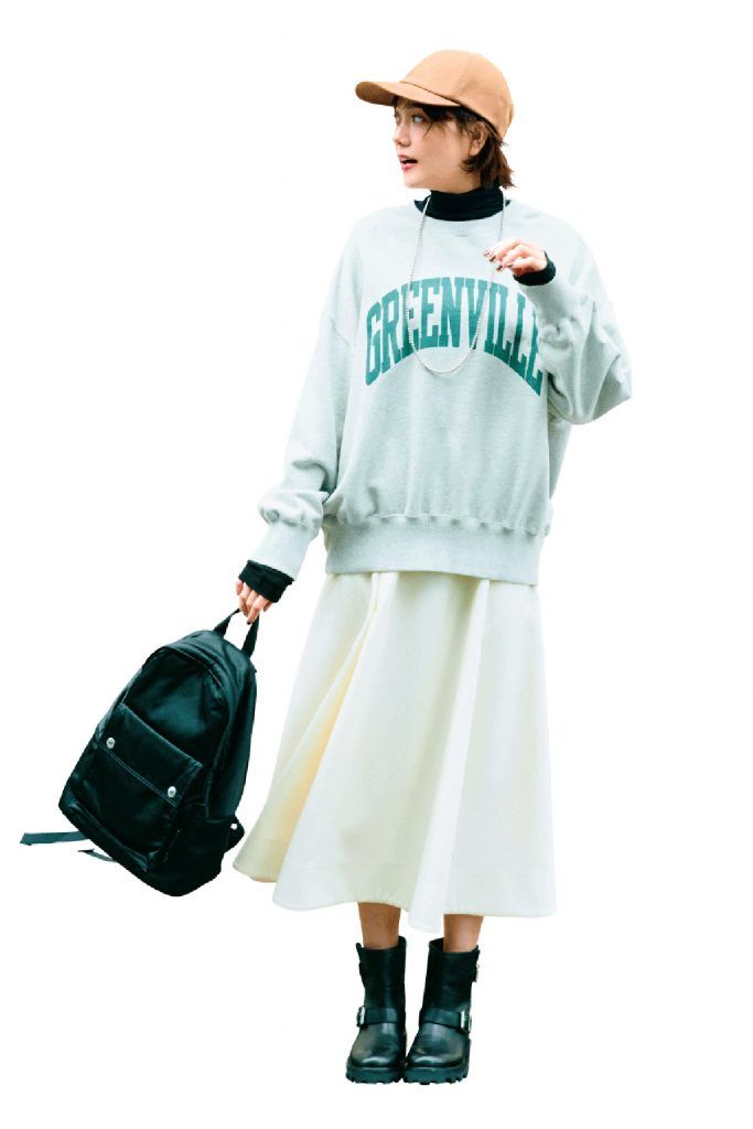 レイヤードに欠かせない、脇役としても力を発揮する黒タートルを、ロゴスウェットの下にイン。メンズライクなトップスが大人顔に引き締まり、防寒もセンスアップも叶います。リュックとブーツを黒でリンクさせ、コーデの完成度を高めて。