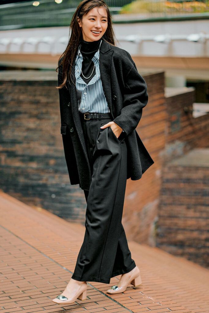 どんなスタイリングにも馴染む冬コーデの万能選手・黒アウターですが、どうしても見た目の重たさが気になるところ。黒タートルとの間にストライプシャツを重ねれば、パッと爽やかにあか抜けます。バックル付きのベージュパンプスで、レディな華やぎを添えるのがカギ。
