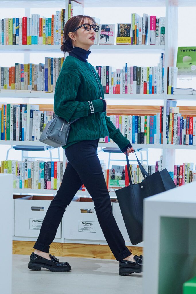 コスパブランドの黒タートル×黒パンツの制服的スタイリングには、メンズのカラーセーターを重ねて。肩幅広めのリラックスシルエットで、黒タートルのまじめさを程よく着崩すことに成功。ローファーでトラッド要素を加えたら、周りとかぶらないオフィカジコーデに着地します。