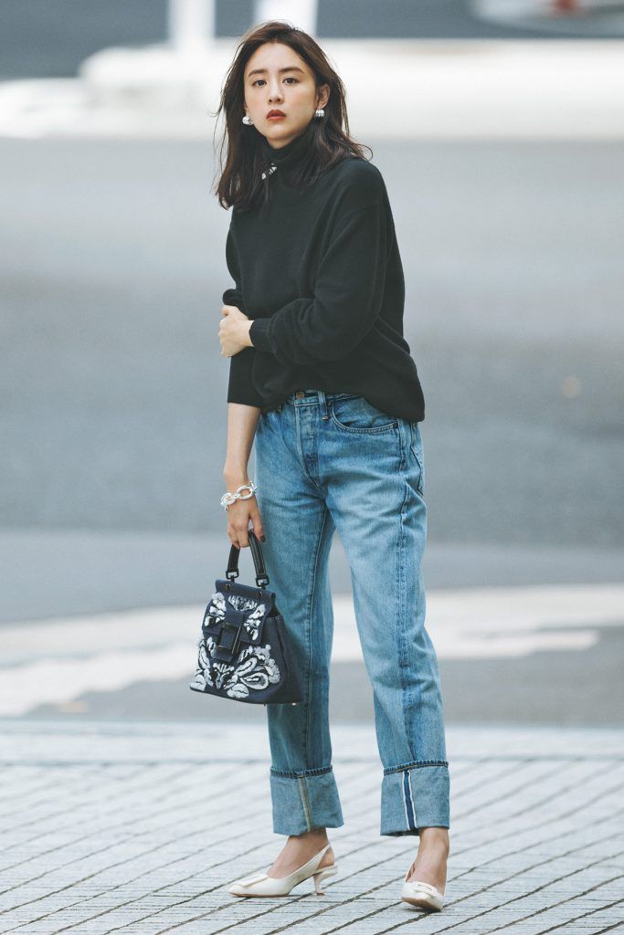 ともすると無難になるデニムコーデは、ディテールに女性らしさを取り込むのがポイントです。ざっくり黒タートル×ロールアップデニムのボーイッシュな雰囲気には、バックスリングパンプスで抜け感を演出。ワンハンドルバッグや華やかアクセを盛りつければ、“シンプルだけどセンスがいい”大人ムードが漂います。