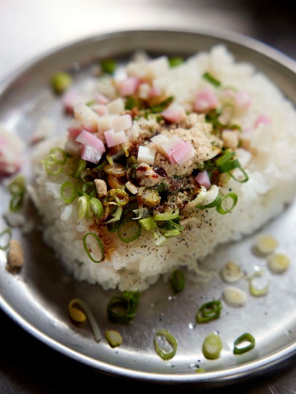 あらかじめご飯に具と調味料をのせてスタンバイ。こうしておくと、モタモタせずに、炒めることに集中できます。