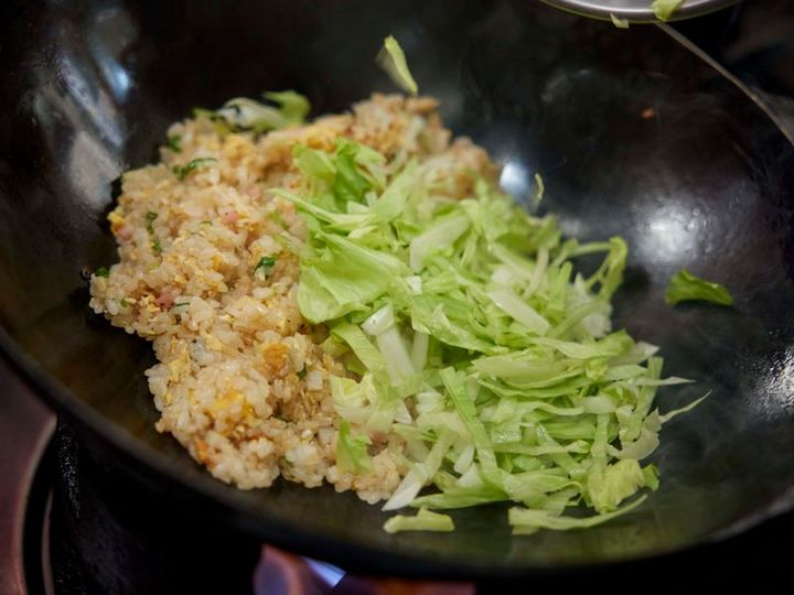 フライパンにサラダ油大さじ2を強火で熱し、溶き卵を入れて大きく混ぜ、半熟になったら(1)のご飯と具を一気に加える。ご飯をほぐしながら炒め合わせ、調味料がなじんだらレタスを加え、さっと混ぜる。