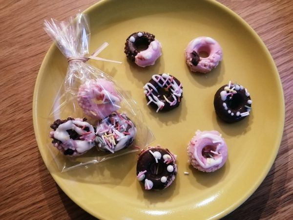 パフを加えたチョコレートを型に流し込み、冷やし固めるだけで作れるひとくちサイズのドーナツ型チョコ。カラフルなトッピングが、かわいいです♡
