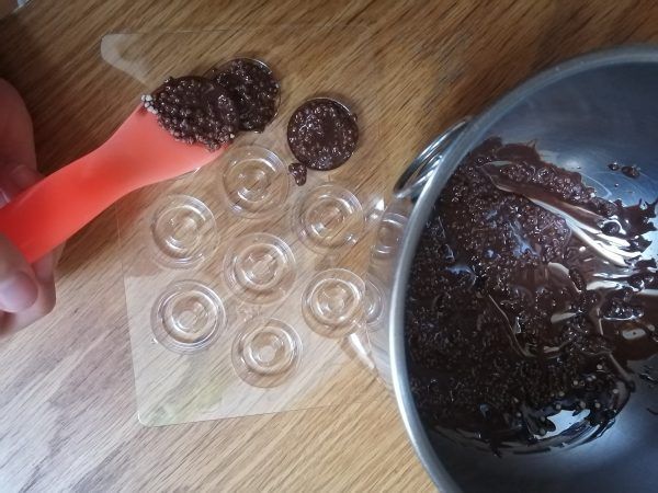 溶かしたチョコレートにパフを混ぜて、型に入れていきます。娘にとっては、この作業がちょっと難しいようで丁寧にゆっくり進めていきます。