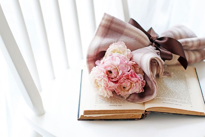 寒い季節の花束の贈り物だからと、マフラーで包んだら、花がふんわりと、よりやさしい雰囲気になりました。花束を渡したあとに、「マフラー!」と気づいてくれるかな? と思うだけで、わくわくします。