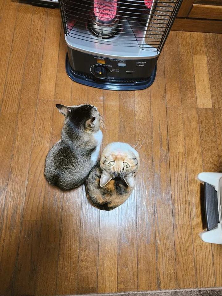 ストーブの前で仲良く暖をとる猫たち。 その姿には、かわいいと絶賛する声や首の動きに驚く声などが寄せられていました。