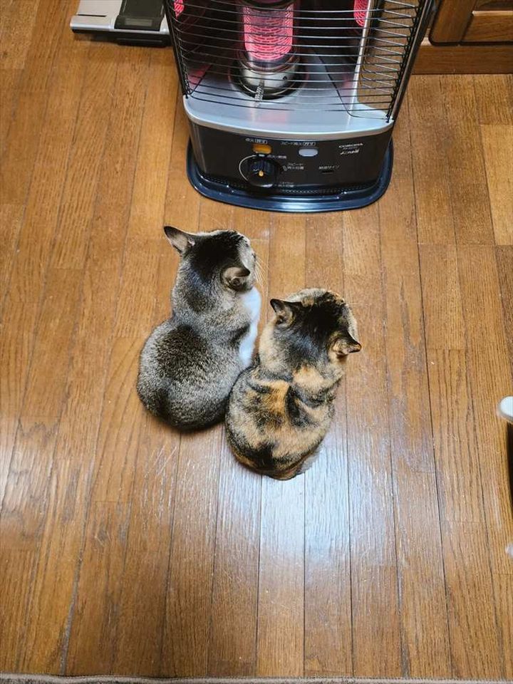 ストーブの前で暖をとっている猫たち。 争うことなく場所をシェアしている姿が、かわいすぎると話題になっています!