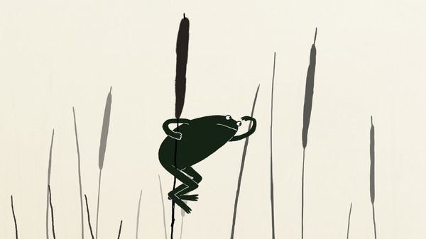 鳥におそわれた毛虫は池に逃げ込みますが、息ができずに沈みそうになります。オタマジャクシが、気泡を送って助けてくれました。お礼に毛虫が、オタマジャクシにキスをすると、オタマジャクシは真っ赤になって、すっかり夢中になります。でも、それぞれ成長して姿が変わってしまうと・・・。フランスらしいちょっとひねりのきいた作品です。