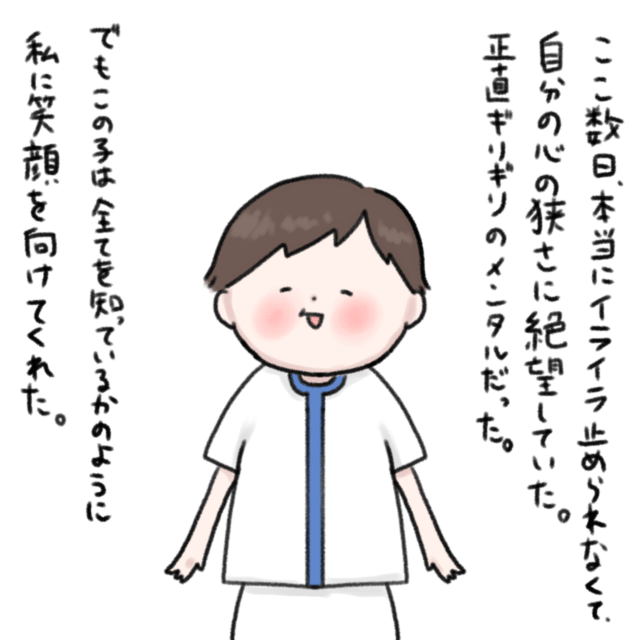 長時間の寝かしつけ、イライラしてしまいますよね。そしてイライラする自分に自己嫌悪・・・。みぃくんの笑顔が「大丈夫だよ。わかってるよ」と言ってくれているように見えますね!
