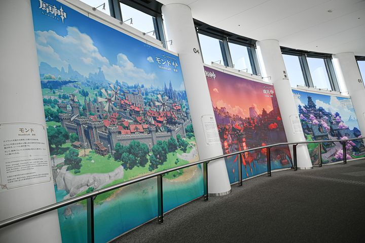 さらに奥へ進んで行くとスロープが。ここは原神世界のそれぞれの国のビジュアルが展示されていました。「モンド」から「フォンテーヌ」まで、あますことなくゲーム世界の絶景も堪能できてしまいます!贅沢な空間で、まったりとそれぞれの国の風景に浸ると、原神での思い出も蘇ってきたり…。新たな冒険にも思いを寄せつつ、巡っていきます。
