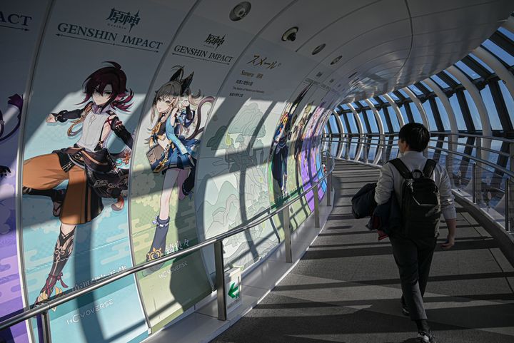 エレベーター内には原神のメインビジュアルイラストが一面に。ドキドキしながら「フロア445」を目指します!
