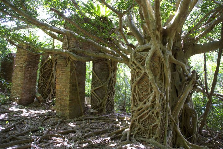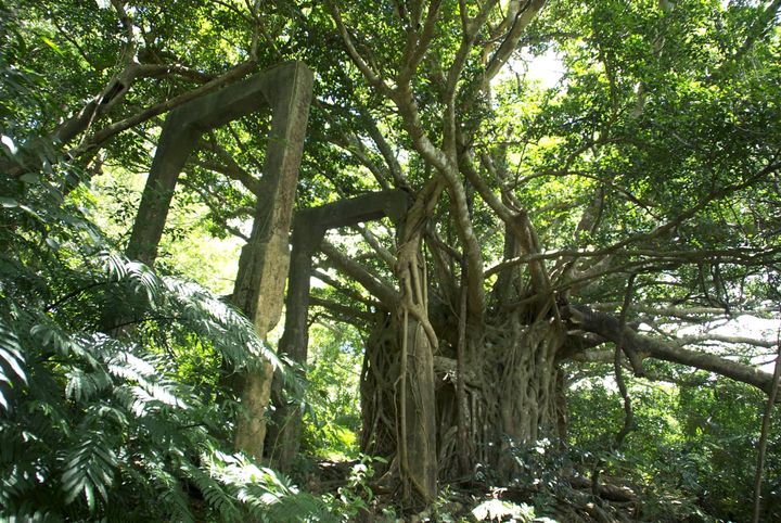 通称「絞め殺しの木」とよばれるアコウの木の根が建物を飲み込み、その廃墟の姿はまるでラピュタの世界のよう。