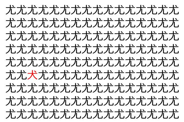 画像の中には、「尤」という漢字が縦に9行、横に16個並んでいます。 全部で144個となりますが・・・、そのうち1つは「異なる漢字」となってますよ!!