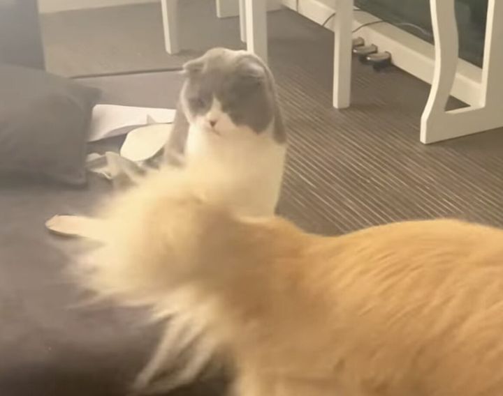 その尻尾が猫さんの顔にバシバシ!
