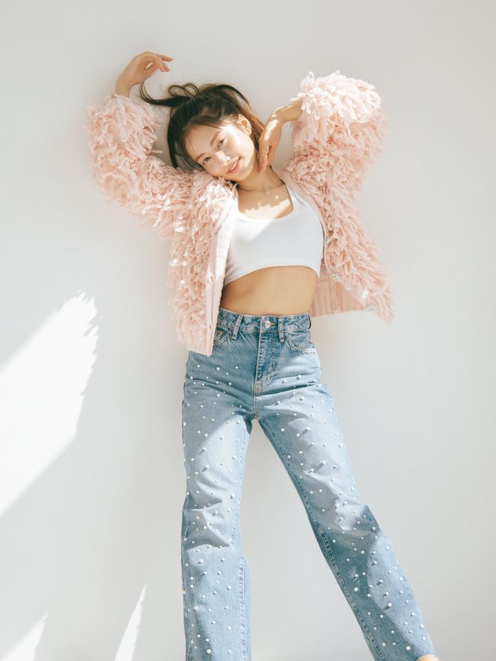 宮田聡子。ar1・2月合併号より ニット¥16,999/H&M(H&M カスタマーサー ビス) デニム¥11,550/サムシング(エドウイン・カスタマーサービス) ジャケット¥39,600/ジャッキー(ジャック・オブ・オール・トレーズ プ レスルーム) ヘアクリップ(2個セット)¥880/アネモネ(サンポークリ エイト) バッグ¥2,790/神戸レタス ソックス¥935/靴下屋(タビオ) スニーカー¥15,400/プーマ(プーマ お客様サービス)