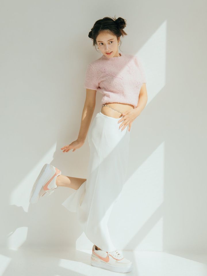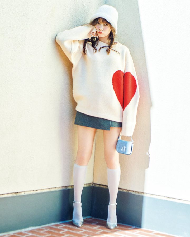 谷まりあ。ar1・2月合併号より ニット¥5,990、スカート¥5,990/ザラ(ザラ カスタマーサービス) スニーカー¥18,150/アトモス ピンク フラッグシップ 原宿店 ピアス¥7,3 00/エルぺ ヴィジブル、リング¥17,600/マサエ(ロードス)