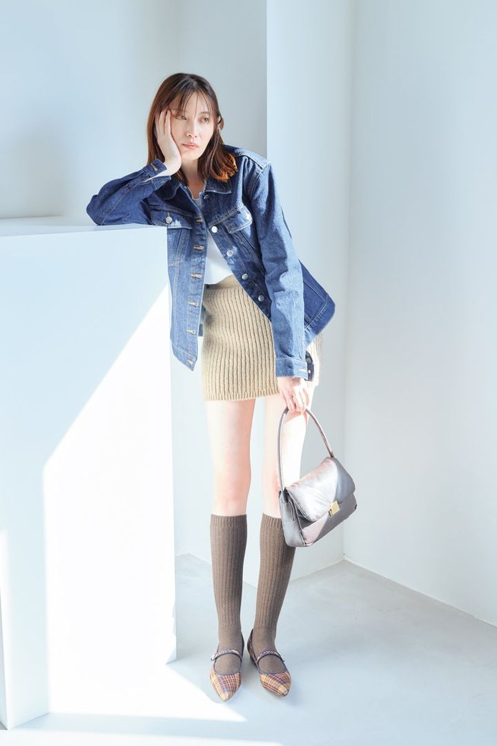 宮田聡子。ar1・2月合併号より ニットワンピース¥9,350/エヴリス(エヴリス 渋谷109店) デニムシ ャツ¥9,350/リーバイス®(リーバイ・ストラウス ジャパン) バッグ¥5,800/Olu. ソックス¥ 660/靴下屋(タビオ) スニーカー¥15,400/ナイキ スポーツウェア(ナイキ カスタマーサービス)