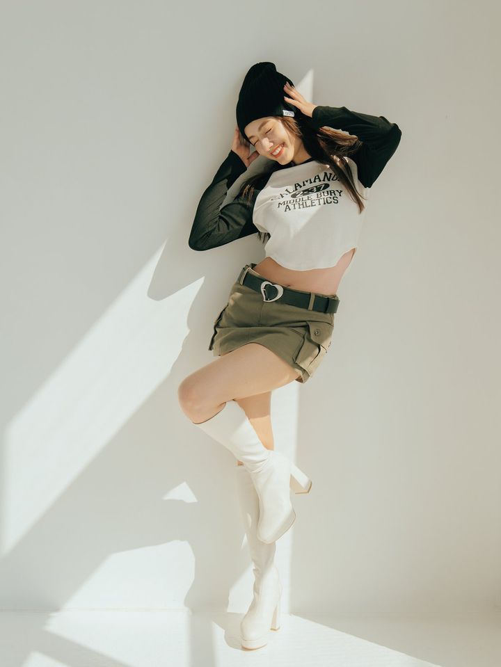 谷まりあ。ar1・2月合併号より Tシャツ¥2,199/フィグメンツ(ウィゴー) スカート¥6,420/バッドレス(ネクスト) ベルト¥6,980/エピヌ ニット帽¥7,700/オーバーライド神宮前店 ブーツ¥29,700/ダイアナ(ダイアナ 銀座本店)