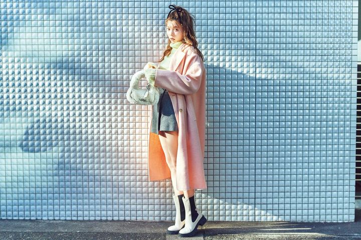 八木アリサ。ar1・2月合併号より コート¥31,900/ノーク トップス¥20,680/ロザリームーン(ロザリー) スカート¥8,690/ココ ディール 髪につけたリボン¥1,650/アネモネ(サンポークリエイト) バッグ¥11,500/ チャールズ&キース(チャールズ&キース ジャパン) ブーツ¥11,990/ランダ