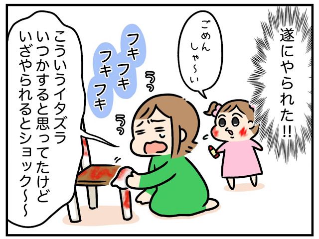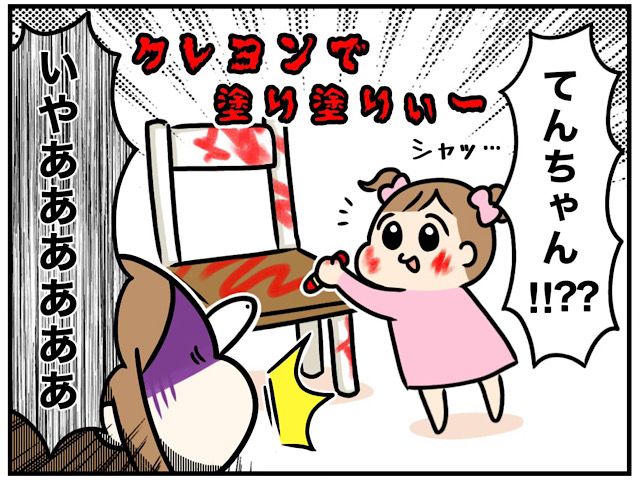 3歳の女の子てんちゃん、1歳の男の子むっくんのママであるなでこさんから、落書きのお話です。ある日、てんちゃんに盛大な落書きをされてしまいショックを受けたなでこさんでしたが・・・。