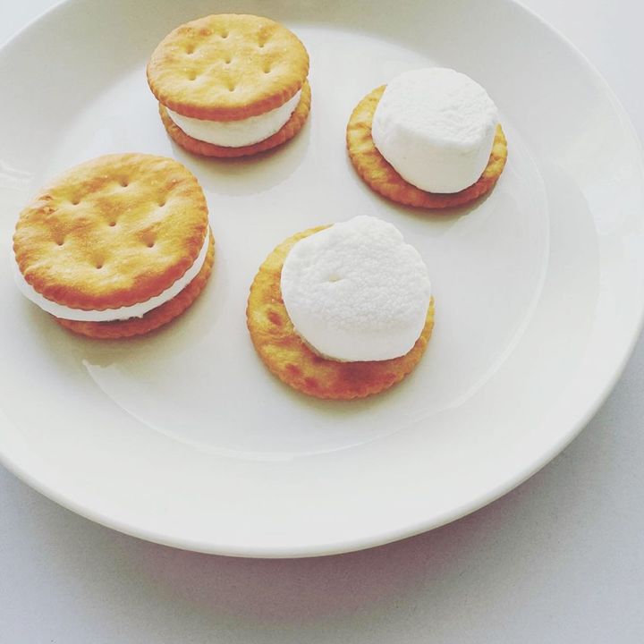 ① 耐熱皿にクラッカーを4枚並べて、その上にマシュマロをひとつずつのせる。
