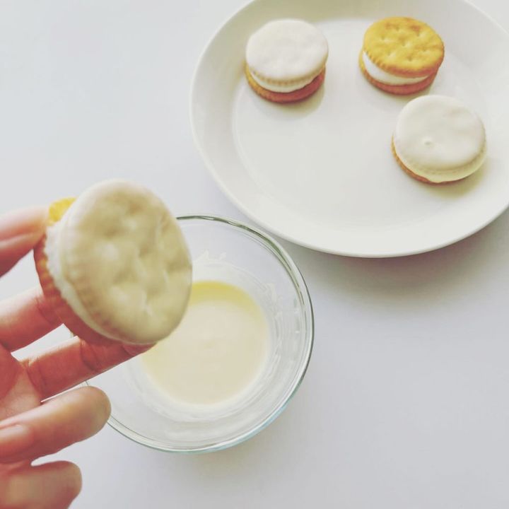 ラップなしで600Wのレンジに10秒〜かけてから取り出して、クラッカーで挟み、軽く押し付けて密着させる。