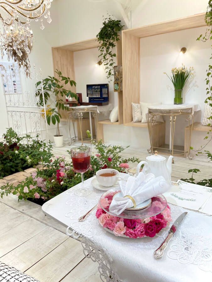 そしてその先のレースカーテンを抜けると、おしゃれなインテリアやお花で装飾されたアフタヌーンティー専用の可愛すぎるティールームが出現……! なんといってもお花が敷き詰められた取り皿が美しくて、本当に可愛いんです♡
