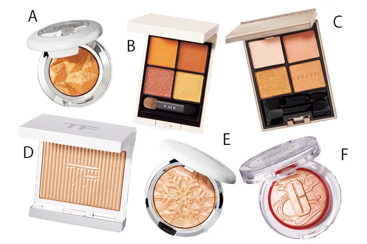 どれもいつものベージュ系メイクに足すだけで、簡単にイベント仕様に。 A. ひと塗りで存在感のある輝きを纏える、メタリックな質感のゴールドアイシャドウ。M・A・C スパークラー アイシャドウ ゴールド クラッシュ¥4,730 ※限定発売(M・A・C)B.微細パールをブレンドしたゴールデンアンバーは肌馴染みが良く、洗練された印象に。RMK シンクロマティック アイシャドウパレット 07 ¥6,380 ※2024年1月12日発売(RMK Division)C.まばゆいゴールドと馴染みベージュの4色は日常にも特別な日にも。ルナソル アイカラーレーション 23 ¥6,820 ※2024年2月9日発売(カネボウ化粧品) D.粒子が細かく立体的、虹色の輝きを放つハイライター。ソレイユ ネージュ グロウ ハイライター 02 ¥10,230 ※限定発売(トム フォード ビューティ)E.リキッドのようになめらかな質感。ローズゴールドのツヤが叶うフェイスパウダー。 M・A・C エクストラ ディメンション スキンフィニッシュ グリームスケイプ¥6,380 ※限定発売(M・A・C)F.気品あるゴールドの輝きを演出する微粒子ハイライター。チーク ポップ ハイライター ゴールド セレブレーション ポップ¥4,180 ※限定発売(クリニーク)
