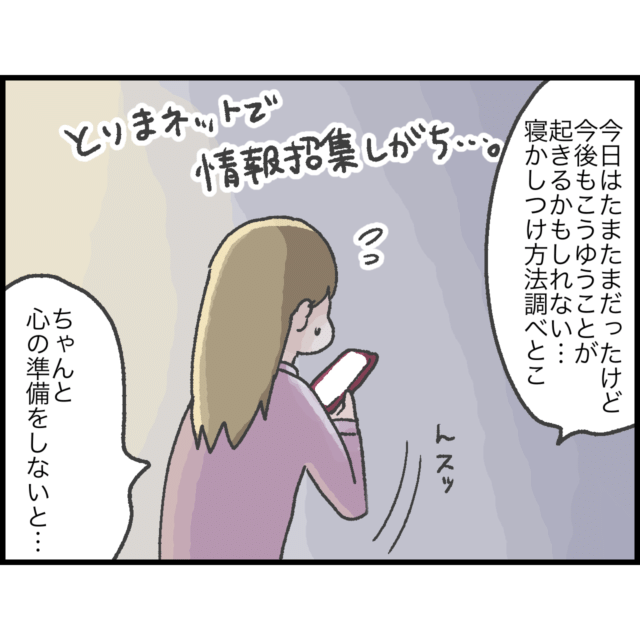 「今日はたまたまだったけど、今後もこういうことが起きるかもしれない・・寝かしつけ方法調べとこ。ちゃんと心の準備をしないと・・」