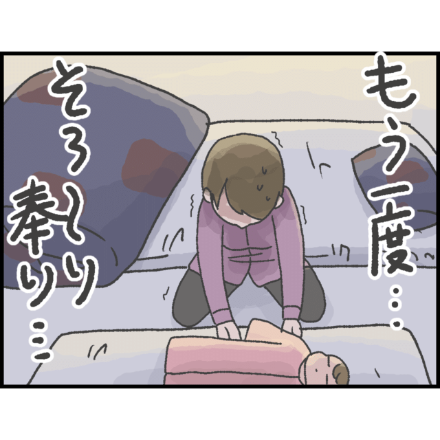 いつものように授乳してすぐに寝てくれなくなってしまった娘ちゃん・・。焦ったしおさんはもう一度正攻法で!と娘ちゃんを抱っこしてゆらゆら・・。うとうとした娘ちゃんをそっと寝かせようとするも爆泣きされてしまい、思わず「詰んだ」と呟くのでした・・。