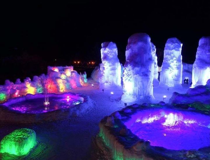 透明度の高い湖水をスプリンクラーで吹き付け凍らせた、大小様々な氷のオブジェが立ち並び、昼はナチュラルブルーに、夜は色鮮やかなライトに照らされた幻想的な世界を愉しめる冬の北海道を代表するイベントです。イベント名:「2024千歳・支笏湖氷濤まつり 氷の美術館」