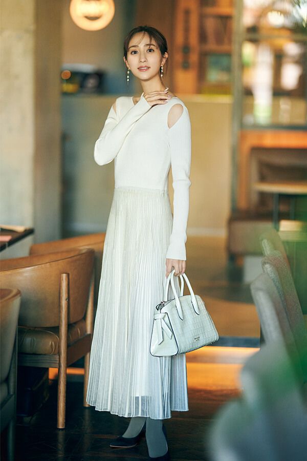 デートではジャケットを脱いで、さりげない肩見せスリットをアピールして彼からの好印象を獲得♡ パールアクセで華やぎも欠かさずに。