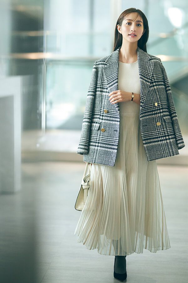 オフィスではジャケットONできちんと感を主張。華奢な時計や清楚なダウンヘアでしごでき感を加速させて。