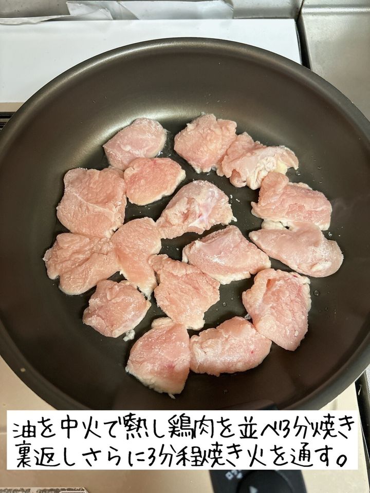 フライパンに油を入れて中火で熱し、鶏肉を並べ3分ほど焼く。こんがりなったら裏返し、3分ほど焼く。